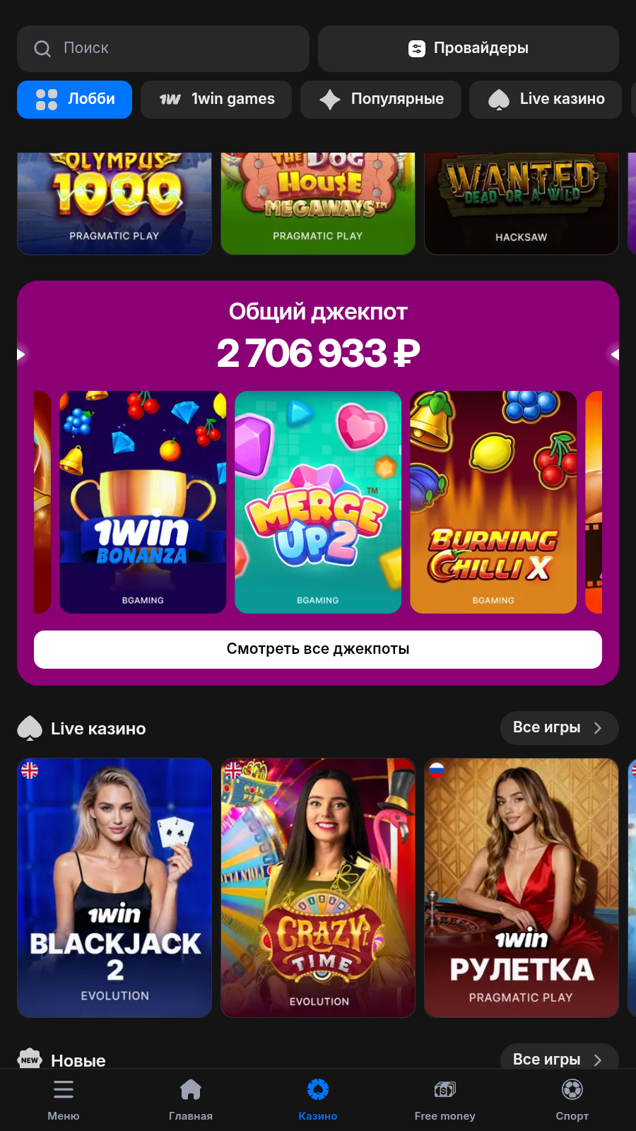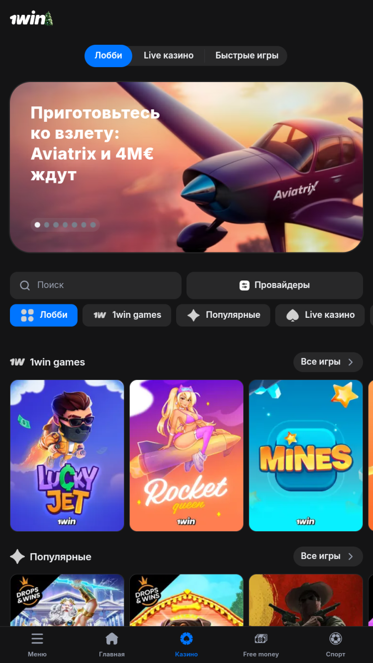 Приложение включает раздел казино с более чем 11 000 играми от 100+ провайдеров, таких как Evolution, Pragmatic, PG Soft, Slotmill, BGaming, а также эксклюзивные 1win Games. Казино предлагает следующие категории игр: