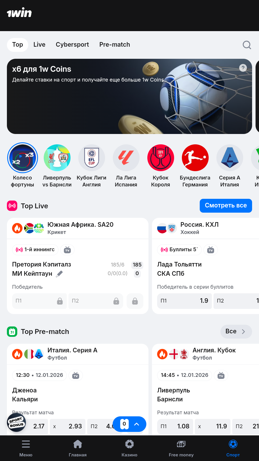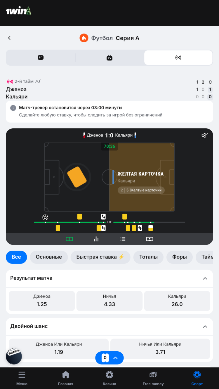 Live - ставки на спортивные и киберспортивные матчи прямо во время игры, с постоянно обновляющимися коэффициентами.