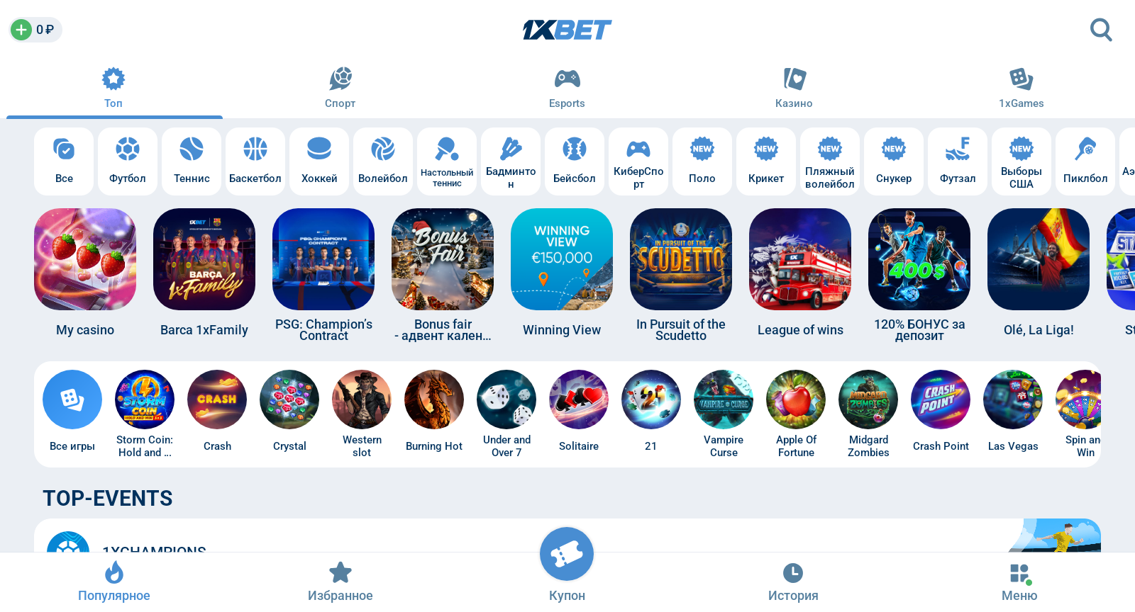 Пользователи приложения могут делать ставки на футбол, баскетбол, теннис, крикет, хоккей, поло, волейбол и многие другие виды спорта и дисциплины. В 1 хБет представлены как локальные, так и международные соревнования, а также подборка самых популярных событий на вкладке Top Events, где можно найти матчи Лиги Чемпионов (1xChampions), Английской Премьер-лиги, Лиги Европы и Ла Лиги.