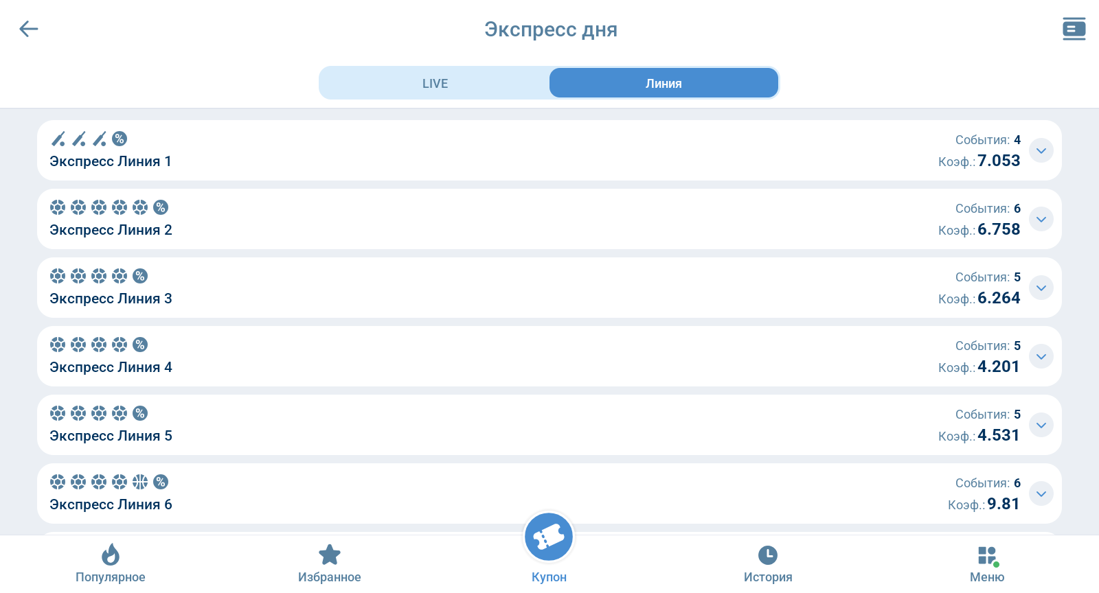 Линия - раздел с предматчевыми событиями во всех доступных видах спорта и киберспорта. Позволяет ставщикам заранее выбрать матчи, изучить коэффициенты, росписи и доступные рынки.