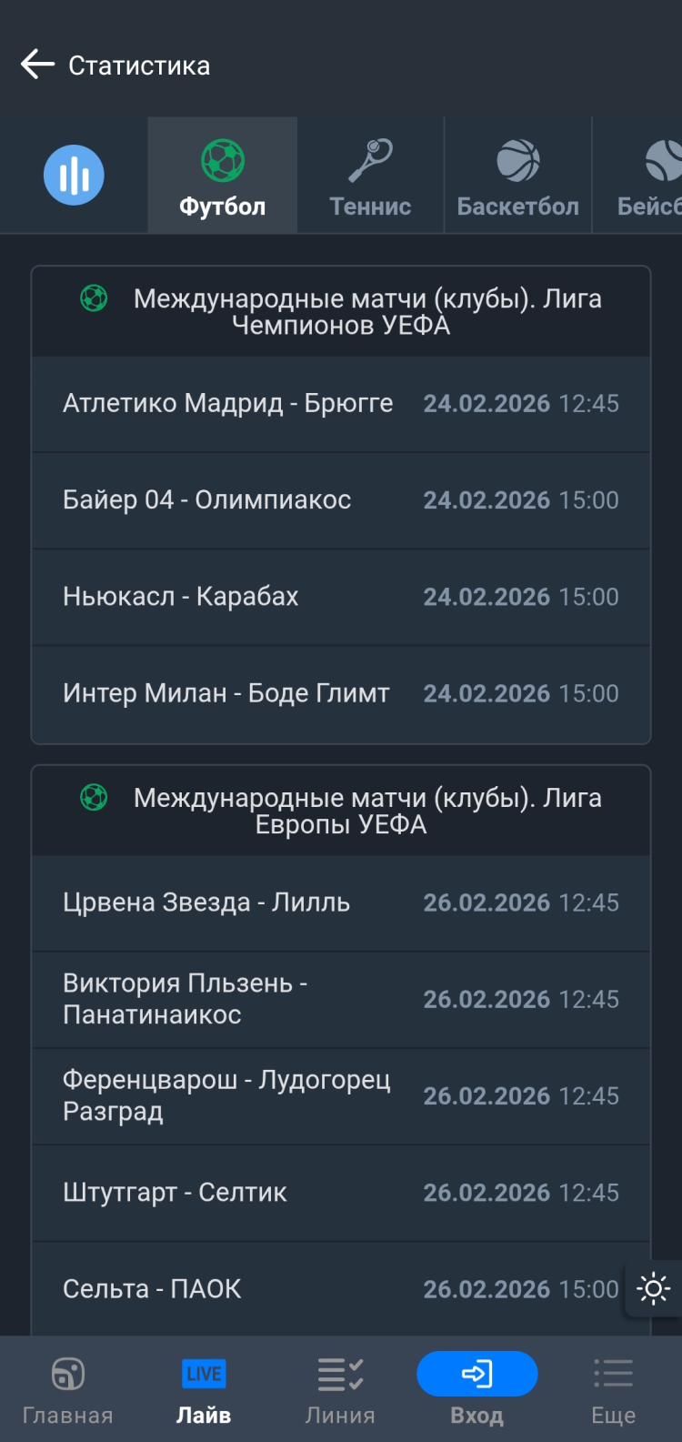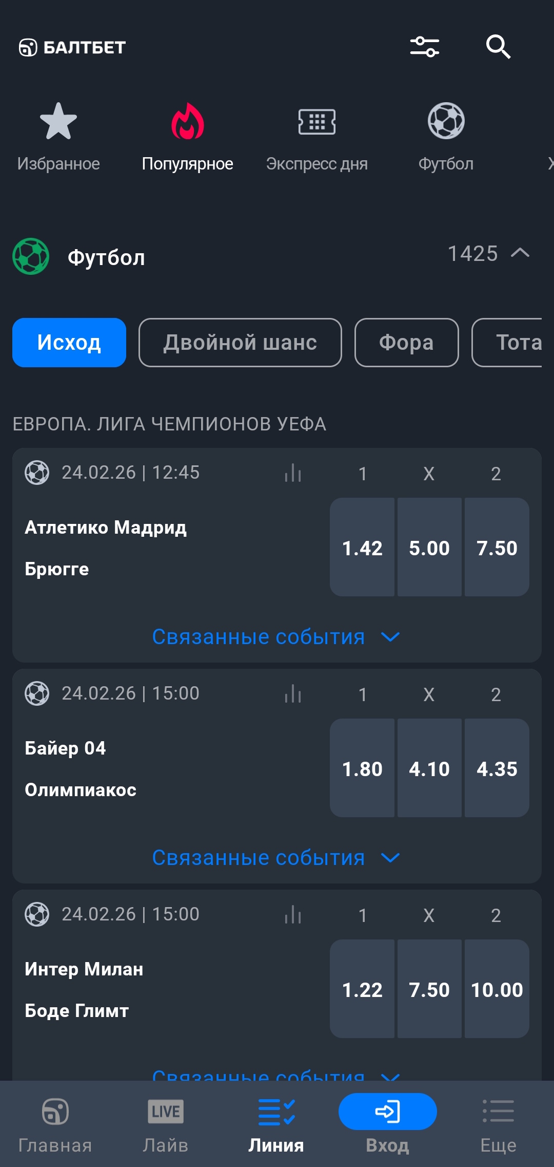 Линия - основной раздел приложения, где пользователи могут заключить пари на исходы предстоящих событий. Реализована возможность фильтрации списка событий по времени проведения матча.