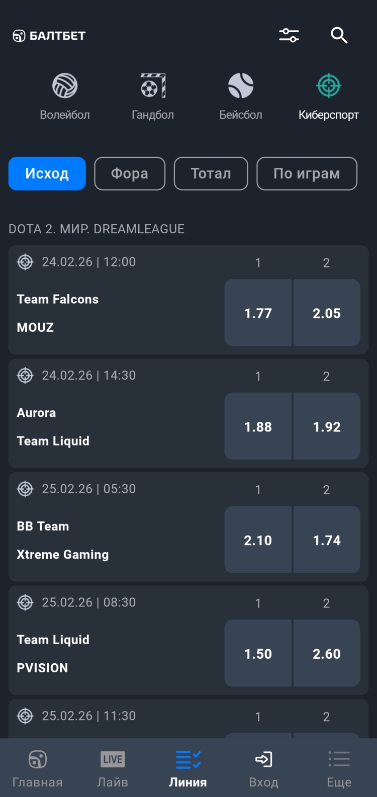 В списке доступных дисциплин как для прематчевой, так и лайв-линии можно найти подраздел "Киберспорт". В нём игроки могут заключать пари на исходы соревнований по большинству популярных дисциплин. На платформе представлены матчи Dreamleague по Dota 2, Blast и PGL по Counter-Strike 2, European Championship по League of Legends и множество других чемпионатов и лиг.