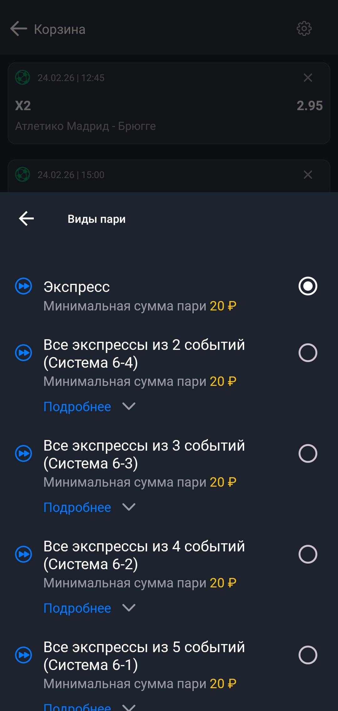 Все экспрессы из N событий - ставка, также называемая "система". Это пари на все возможные комбинации экспрессов из выбранных 3–16 событий (до 12 870 вариантов). Выигрыш равен сумме выигрышей всех включённых экспрессов.