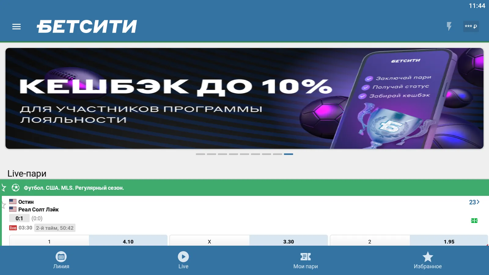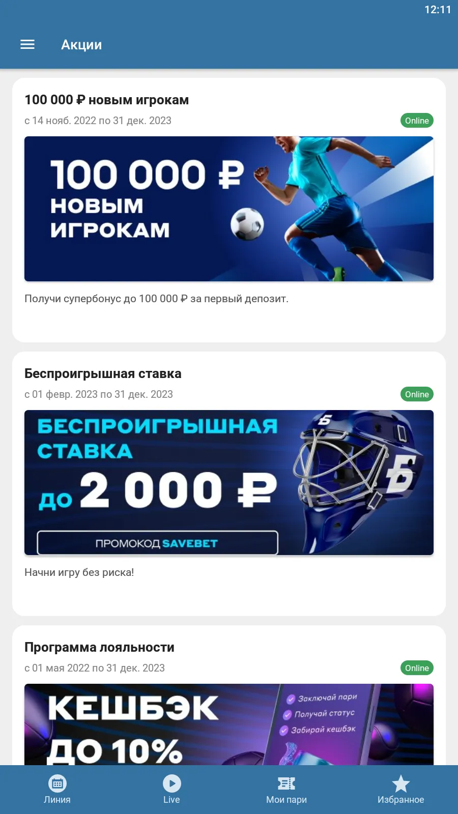 Постоянные игроки получают кэшбэк до 10–25% от проигранных средств в виде фрибетов, бонус 5% на экспрессы (4+ события, коэффициент от 1.5) и участие в лотереях. Акции доступны в разделе «Промо» приложения.