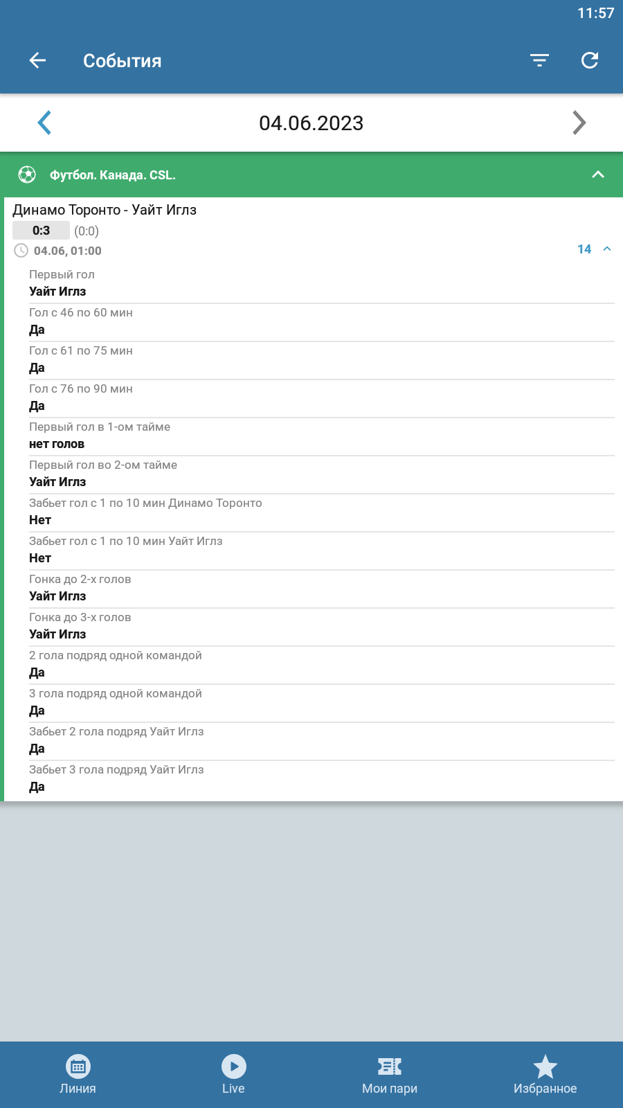 Раздел «История» показывает текущие и завершенные пари, статус расчетов. Push-уведомления информируют о результатах.