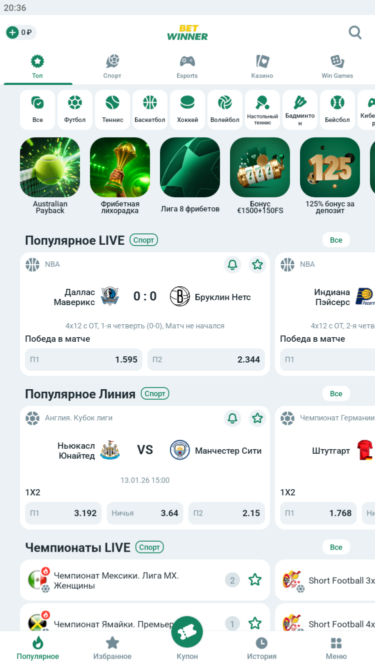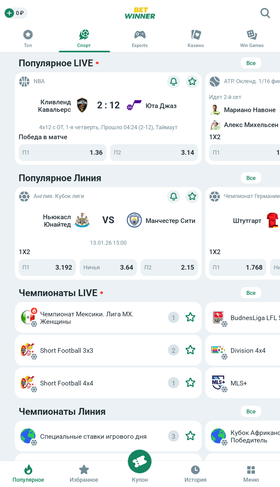 Приложение Betwinner полностью повторяет функции сайта, предлагая ставки на более 30 видов спорта и специальные события. Пользователи могут выбрать матчи разных лиг, включая NHL, NBA и Bundesliga, а также воспользоваться подборками "Топ Чемпионаты", "Топ Игры" и "Рекомендованные" для быстрого доступа. Кроме спортивных ставок, доступны пари на погоду, новости политики и даже освоения космоса.