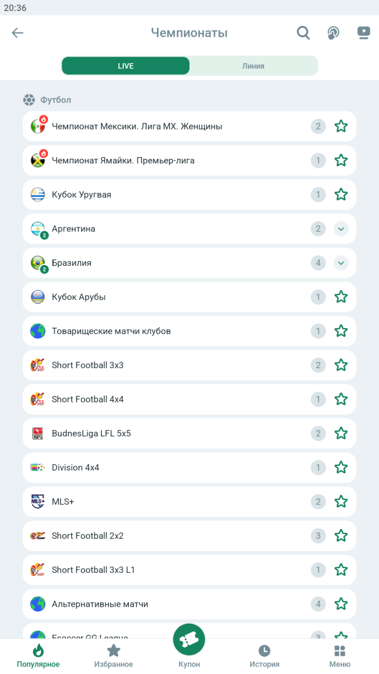 Избранное - сохранение событий, команд или лиг в персональном списке избранного.