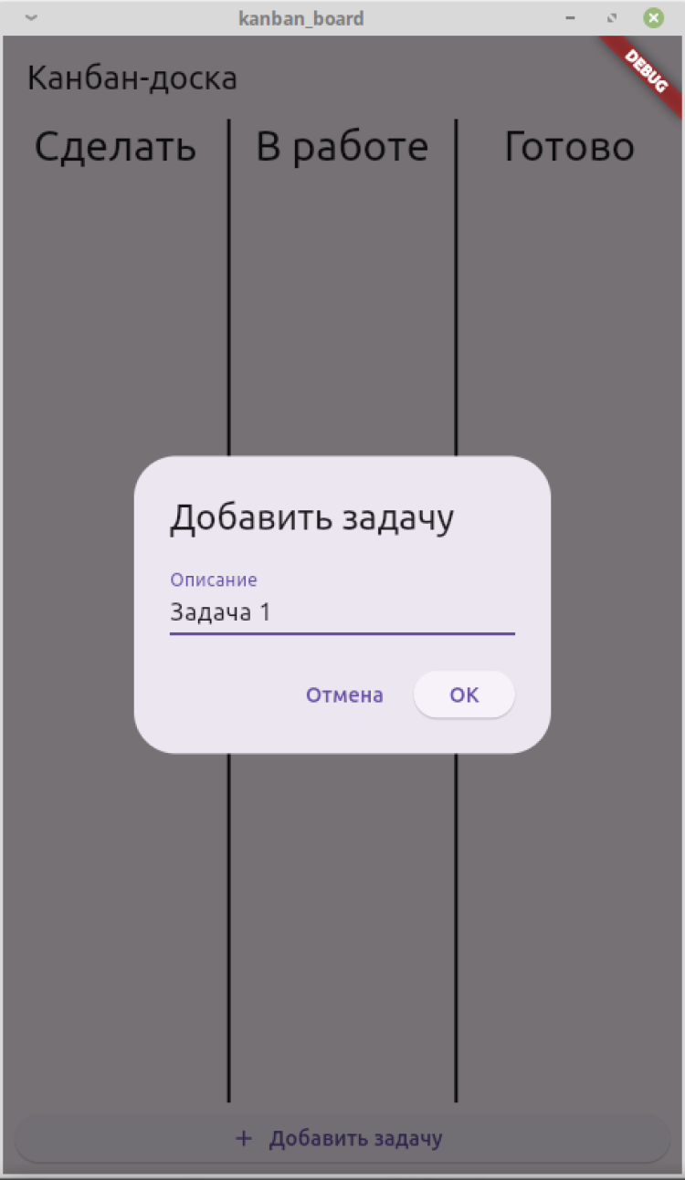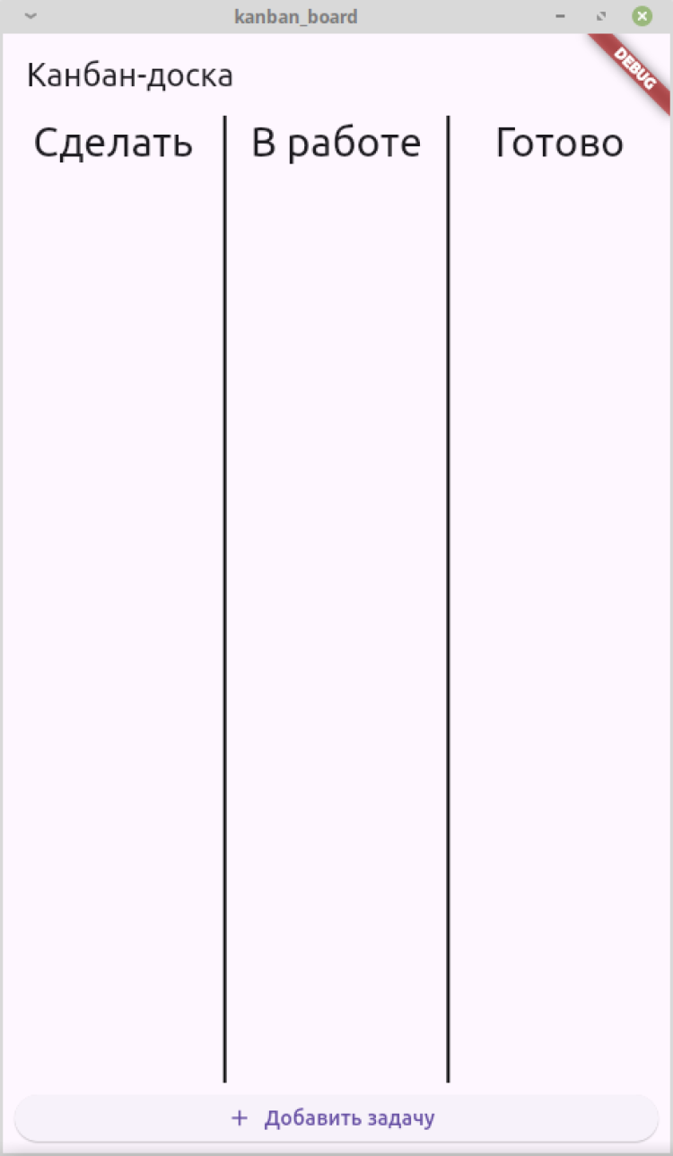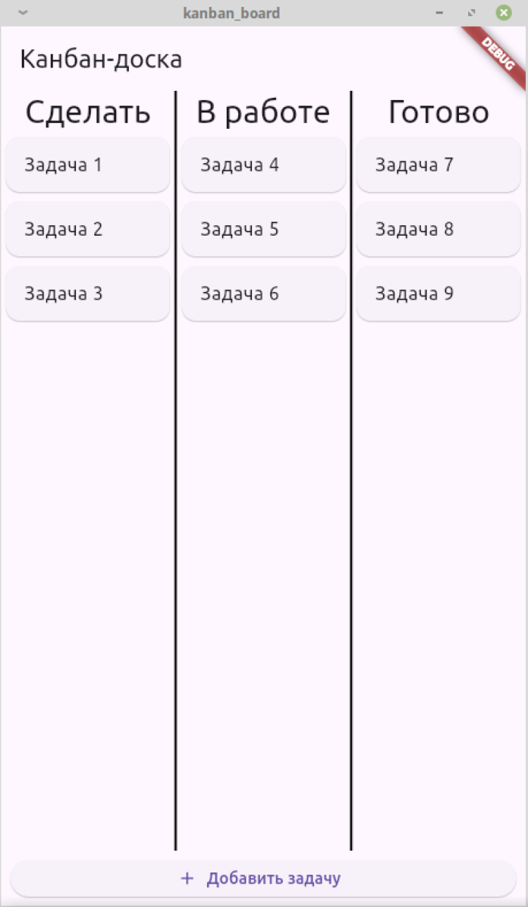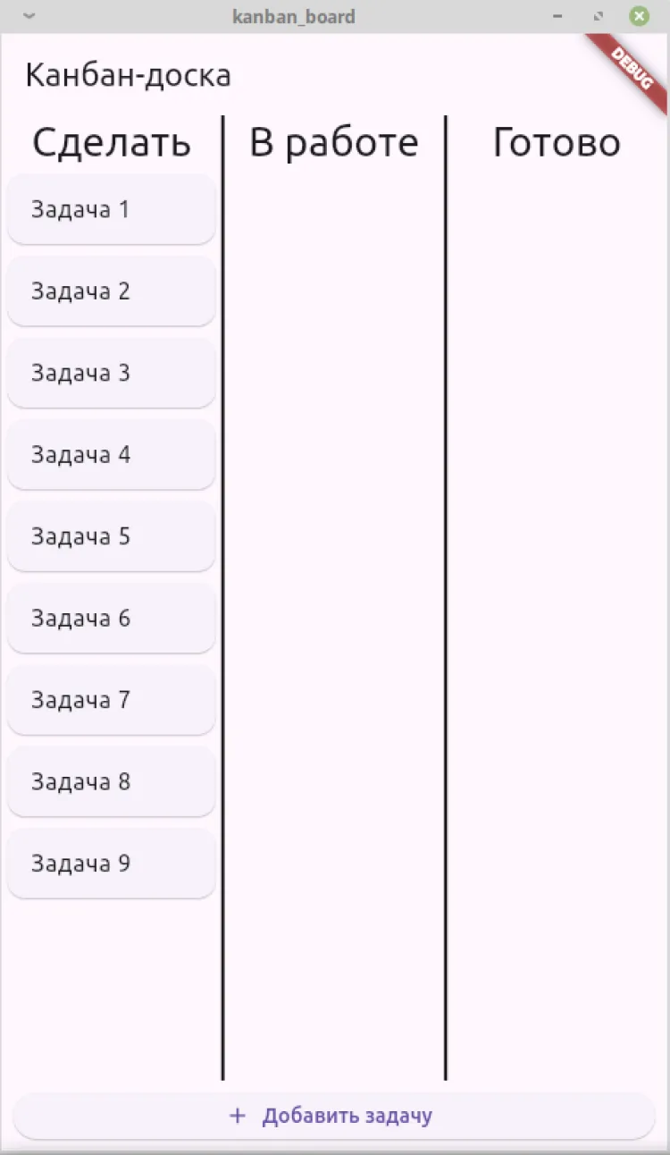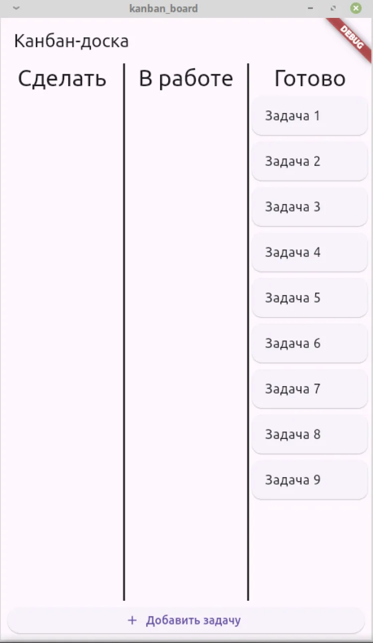 Канбан-доска — приложение для ежедневного использования. Добавленная задача появляется в первой колонке «Сделать». Если пользователь берет ее в работу, то перемещает в среднюю колонку. Выполненная задача переносится в колонку «Готово». При необходимости любую задачу можно удалить.
