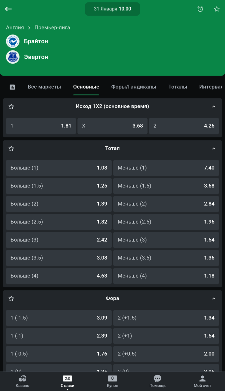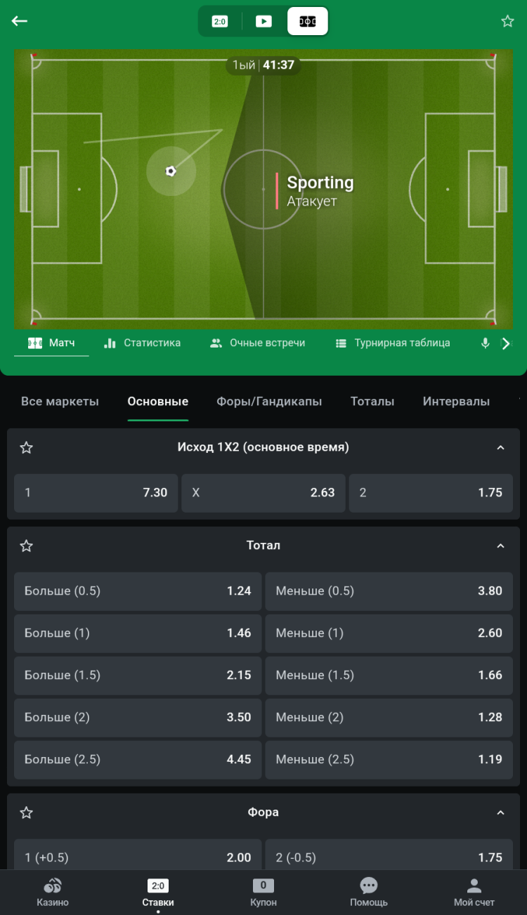 Полный функционал, как на сайте букмекера