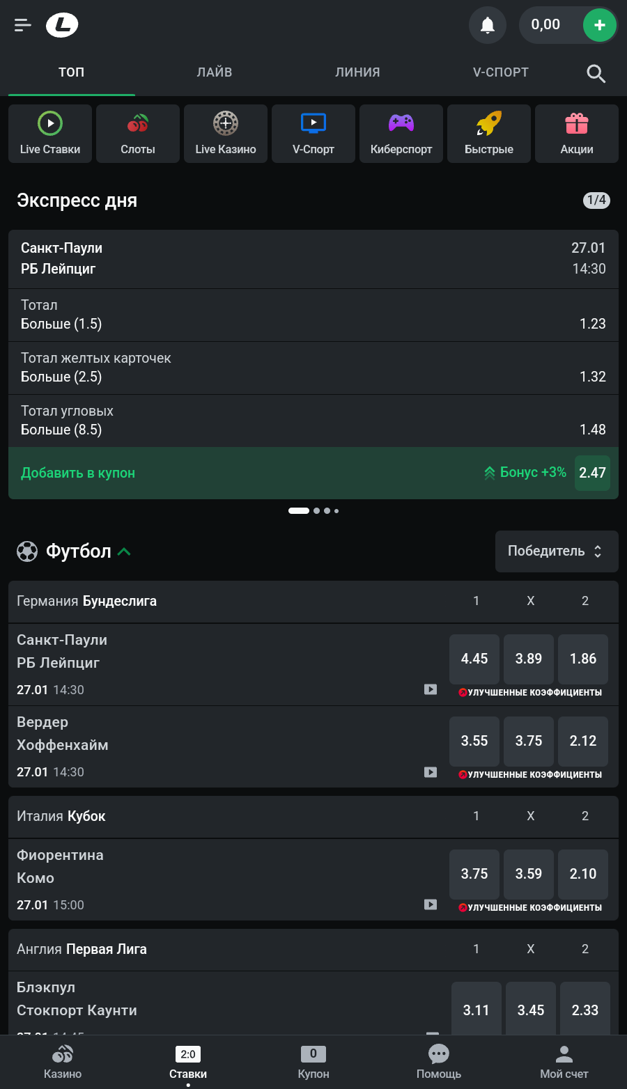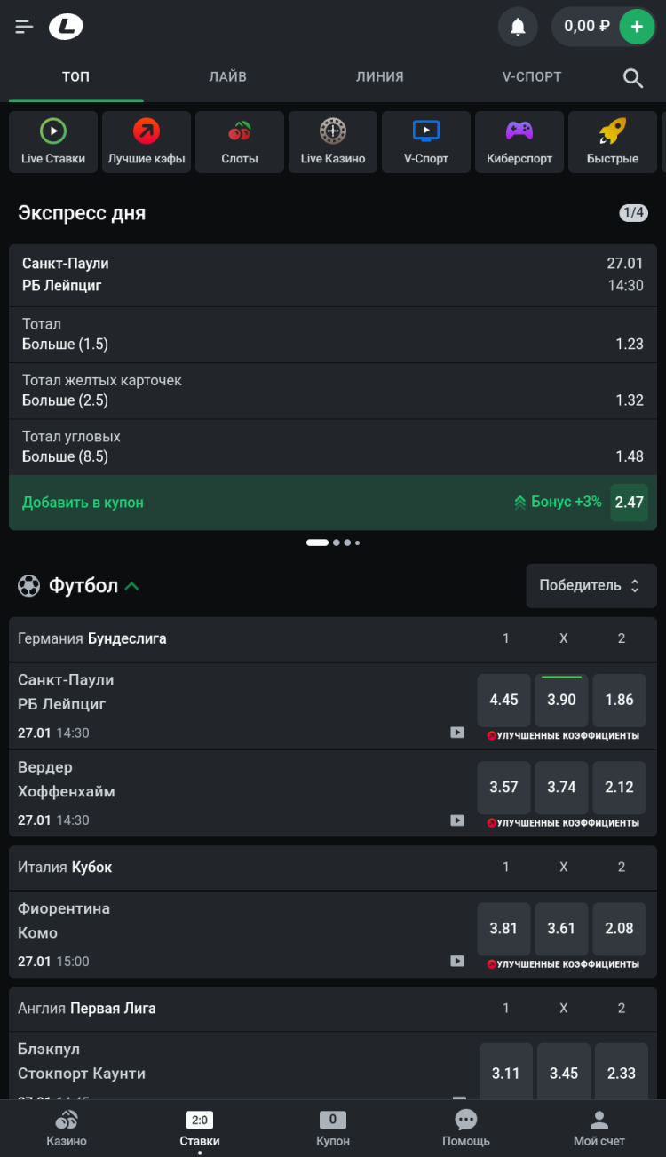 Лучшие кэфы - это раздел, в котором собраны события с самыми выгодными коэффициентами дня, что позволяет получить максимальные потенциальные выплаты в случае выигрыша.
