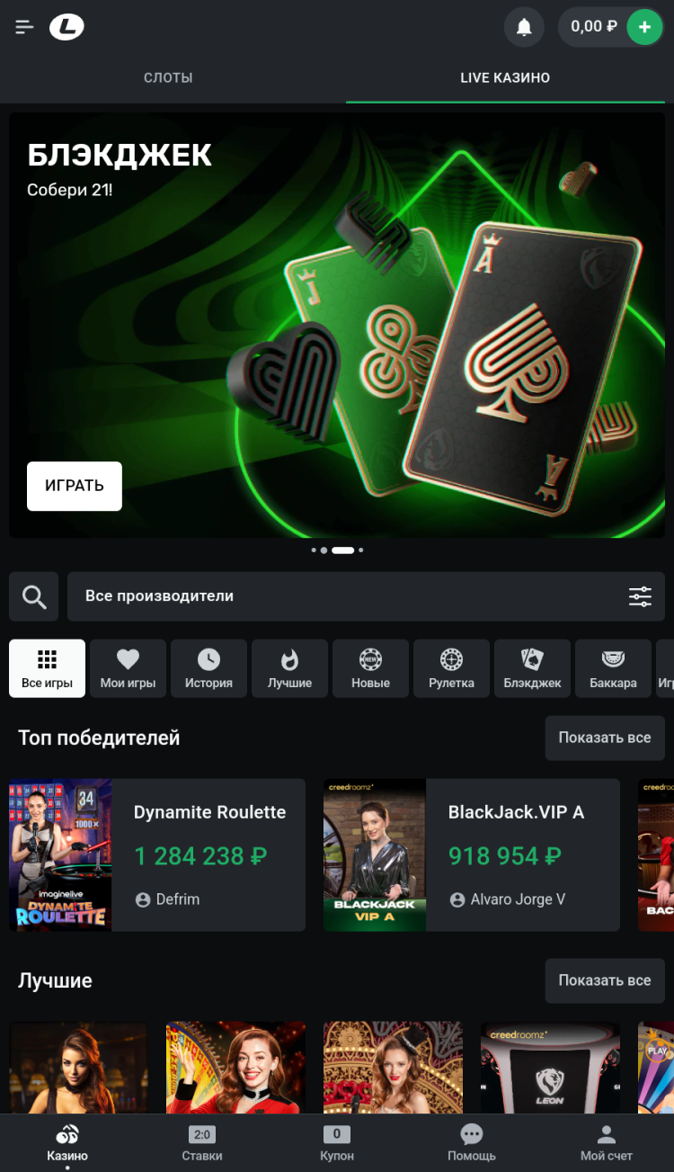 Live-казино - раздел приложения Леон, в котором представлены онлайн-игры с живыми дилерами, такие как баккара, рулетка, покер и т.д. Игры проводятся в формате видеотрансляций, а наличие столов с дилерами, говорящими на русском или других языках, зависит от региона пользователя.