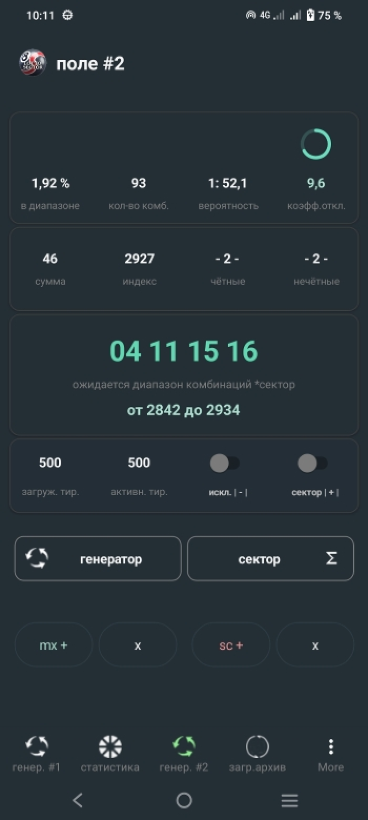Генератор довольно сложный, но для пользователя очень простой. Достаточно обновить архив тиражей, нажать кнопку "сектор", затем получить комбинацию или несколько - на серию игр.