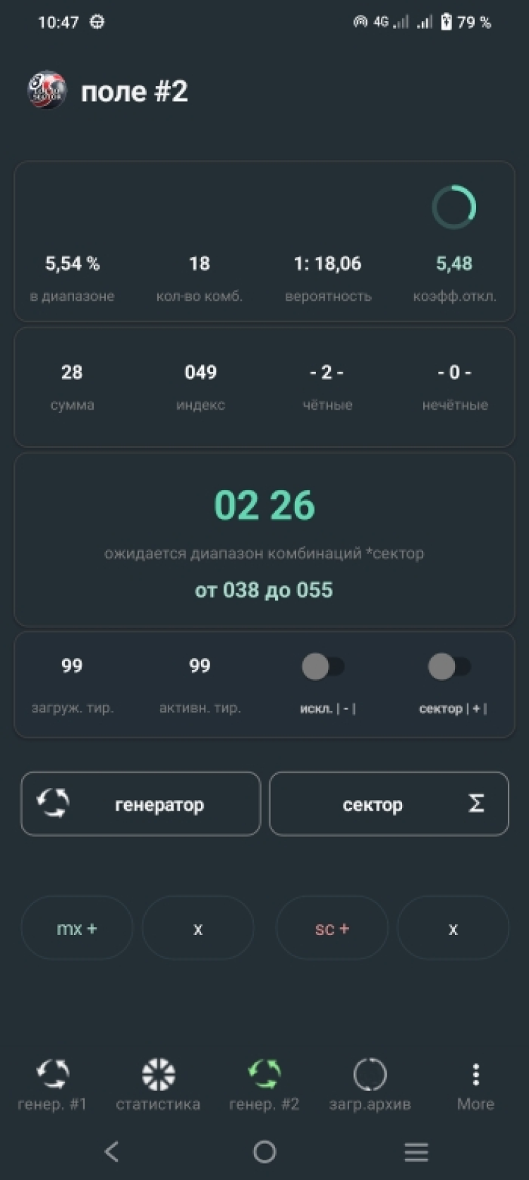В приложении реализован «комбинаторный генератор» с функцией «сектор», который работает с полной системой, выделяя специальными алгоритмами самую вероятную часть (сектор) — на цикл игр.