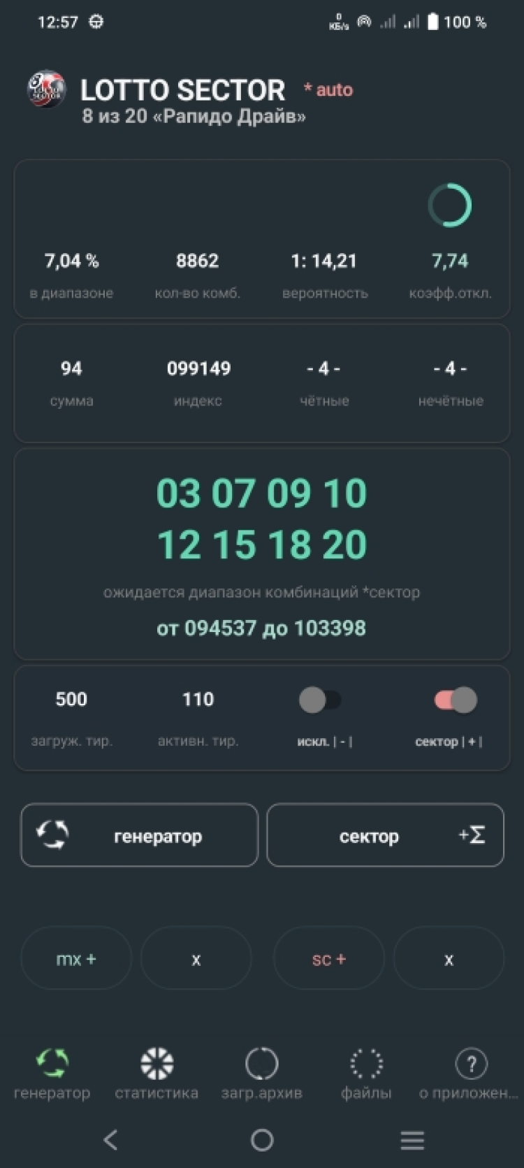 В приложении реализован «комбинаторный генератор» с функцией «сектор», который работает с полной системой, выделяя специальными алгоритмами самую вероятную часть (сектор) — на цикл игр.