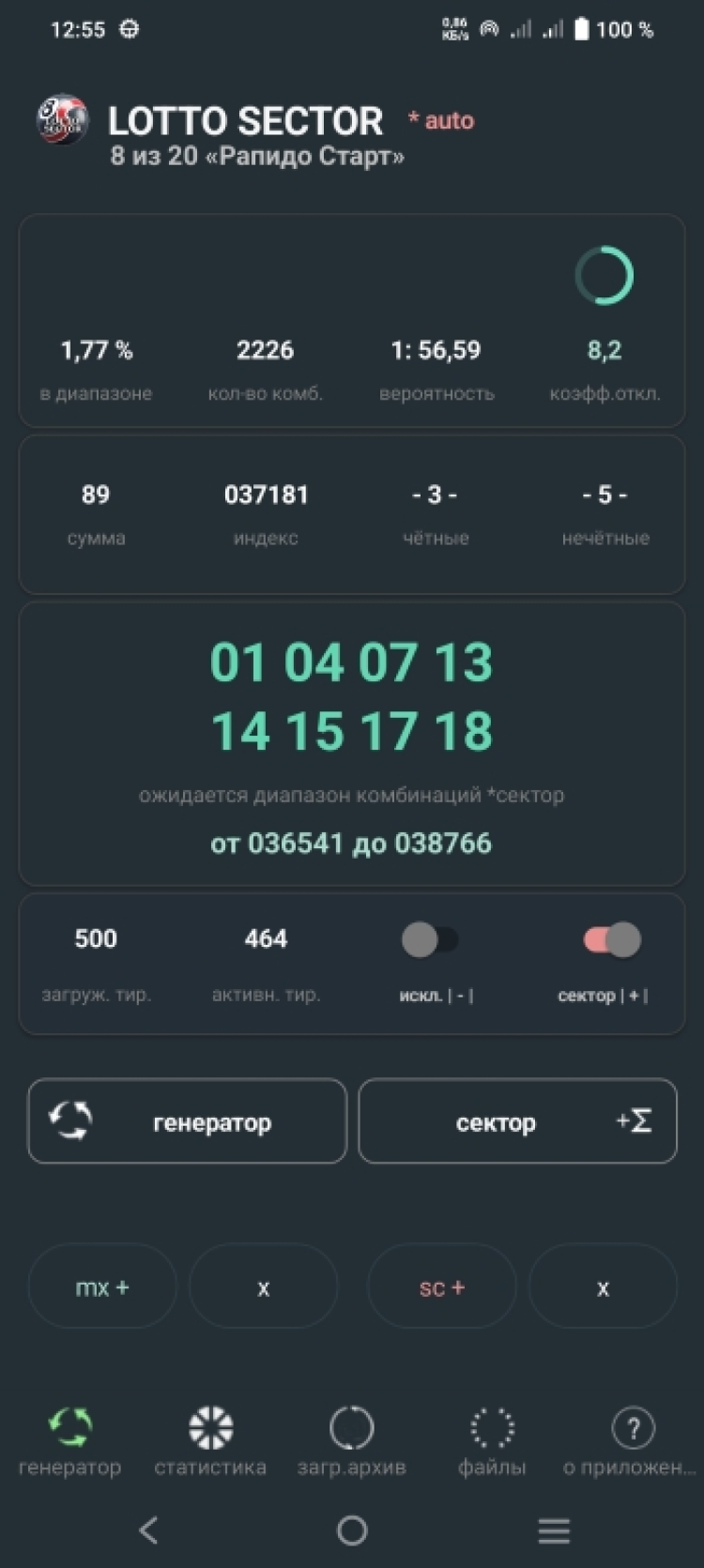 LOTTO SECTOR - стратегический генератор комбинаций для лотереи "Рапидо Старт” 8х20