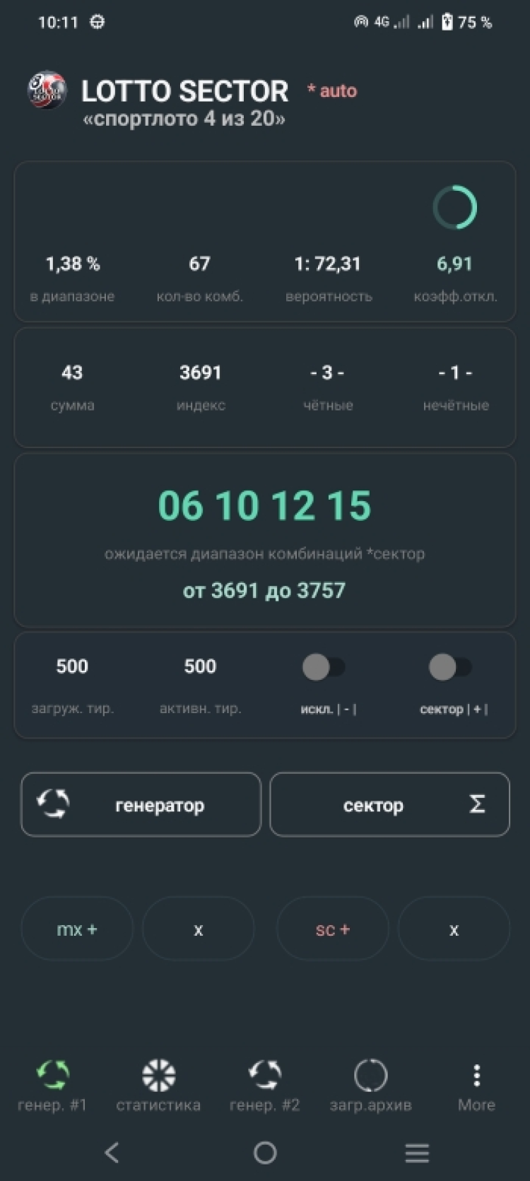 Генератор довольно сложный, но для пользователя очень простой. Достаточно обновить архив тиражей, нажать кнопку "сектор", затем получить комбинацию или несколько - на серию игр.