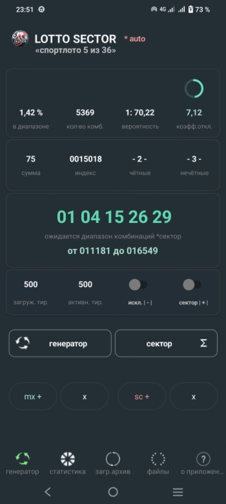 Генератор довольно сложный, но для пользователя очень простой. Достаточно обновить архив тиражей, нажать кнопку "сектор", затем получить комбинацию или несколько - на серию игр.