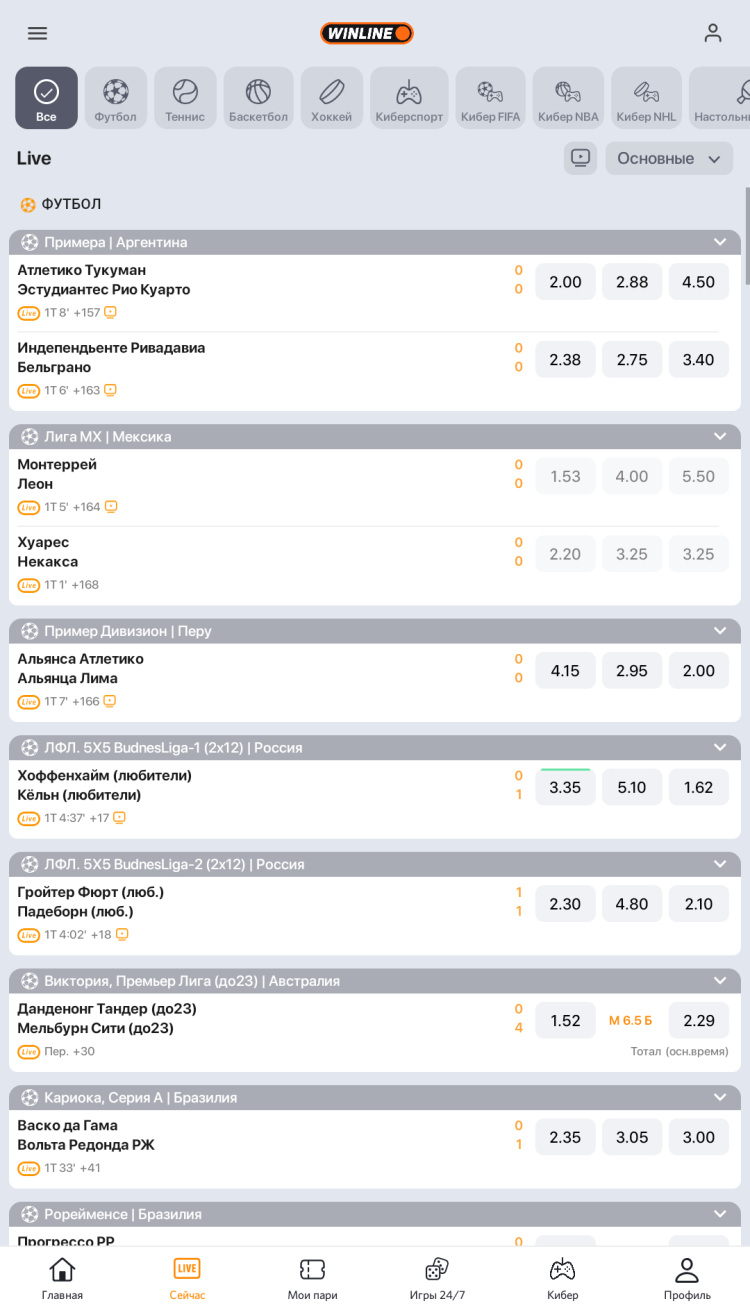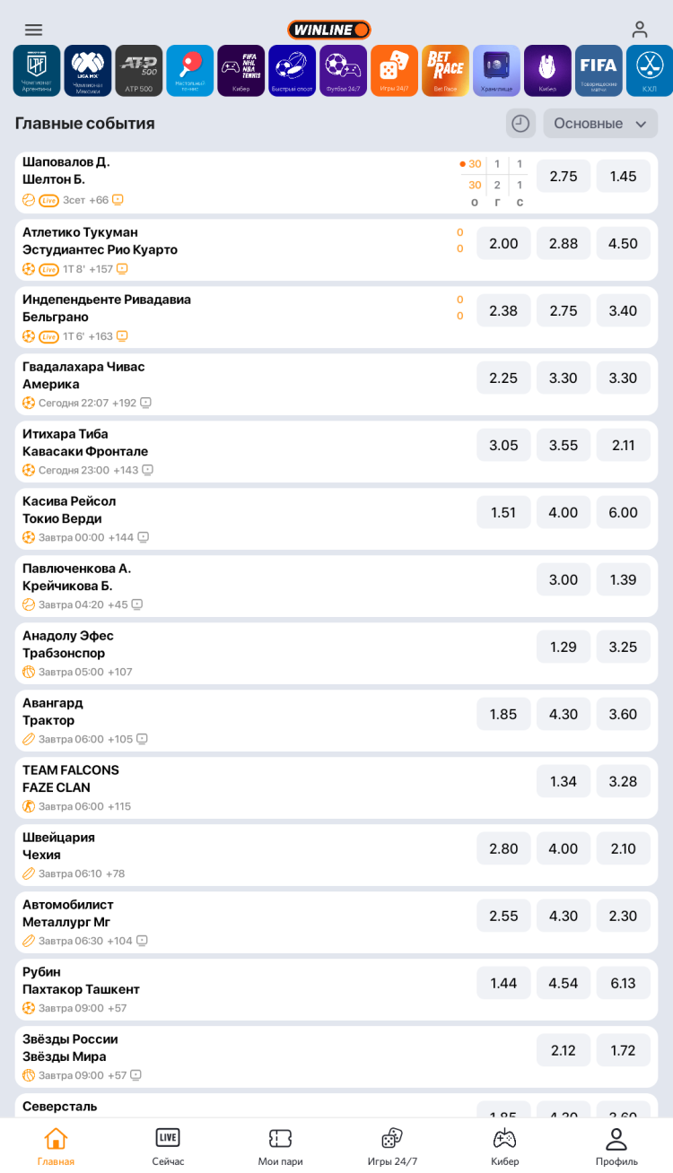 Приложение Винлайн дает игрокам возможность делать ставки на все популярные виды спорта, включая футбол, баскетбол, хоккей, теннис и другие. На Винлайн доступны как локальные, так и международные турниры, такие как матчи Лиги конференций, Лиги чемпионов, Бундеслиги и прочие.