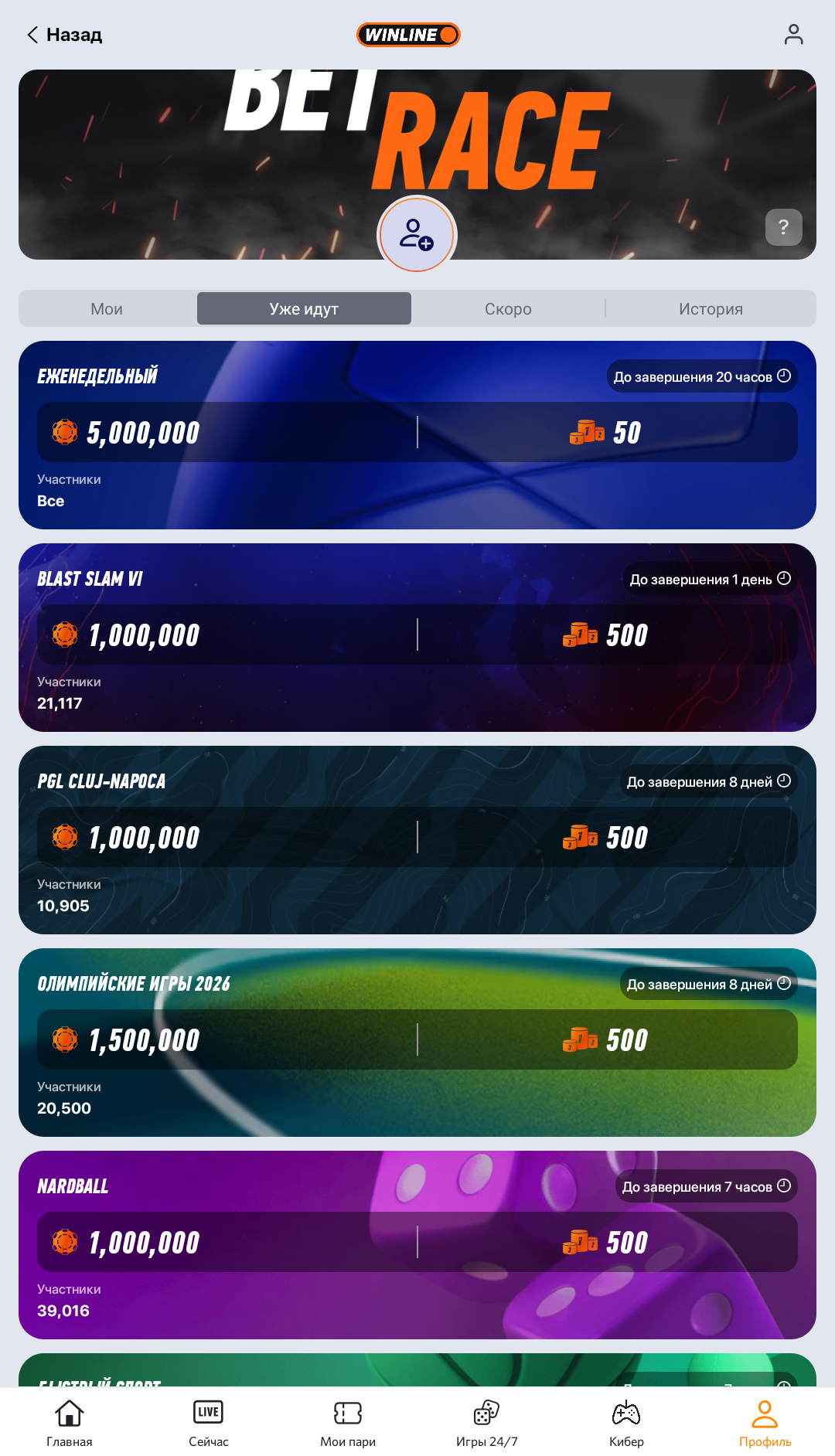 BetRace - регулярные турниры с призовым фондом до 25 000 000₽. У каждого турнира свои правила. Для участия в каждом турнире требуется отдельное подтверждение.
