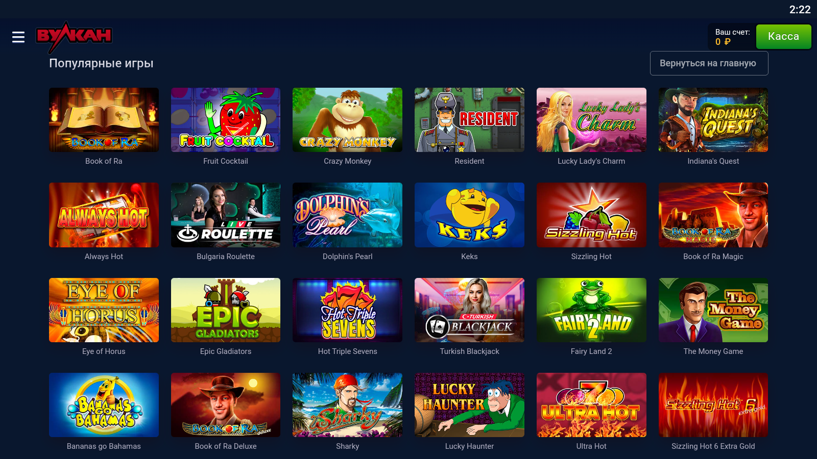Vulcan предлагает множество возможностей для любителей азартных игр. На этой платформе вы найдете огромное разнообразие игровых автоматов, которые привлекут вас своей уникальной тематикой и захватывающими игровыми механиками. Каждый из них может похвастаться превосходной графикой и качественными звуковыми эффектами, создавая неповторимую атмосферу и обеспечивая наилучший игровой опыт для пользователя.