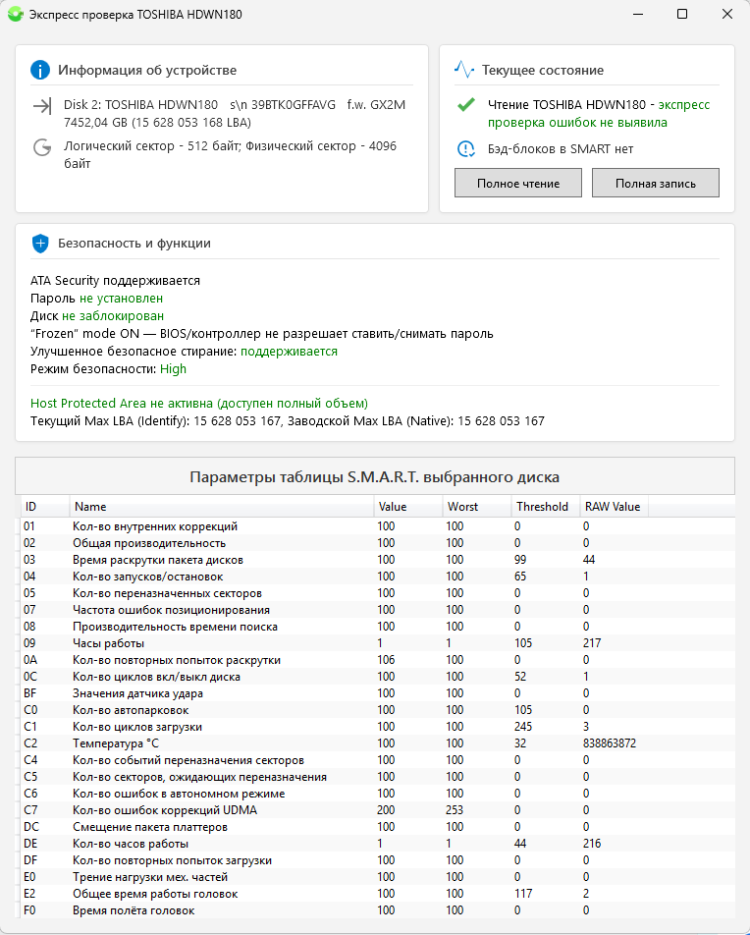 Вывод параметров диска (кол-во LBA, размер сектора, версия f.w., rpm и т.д.)