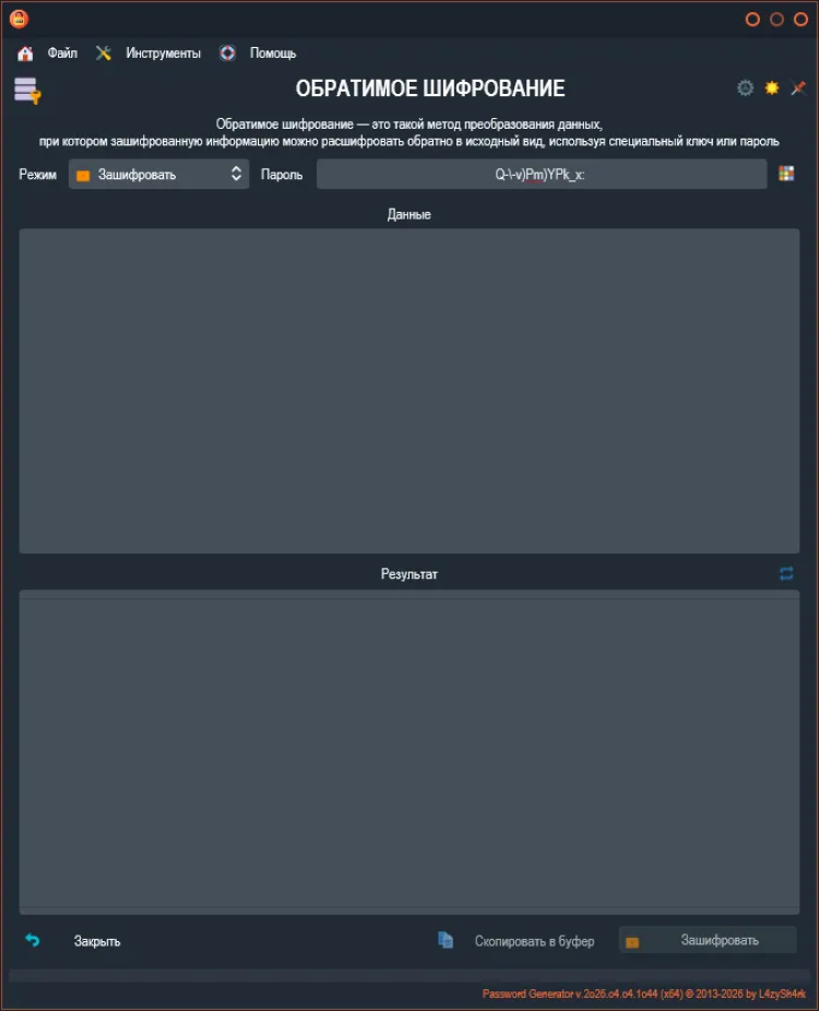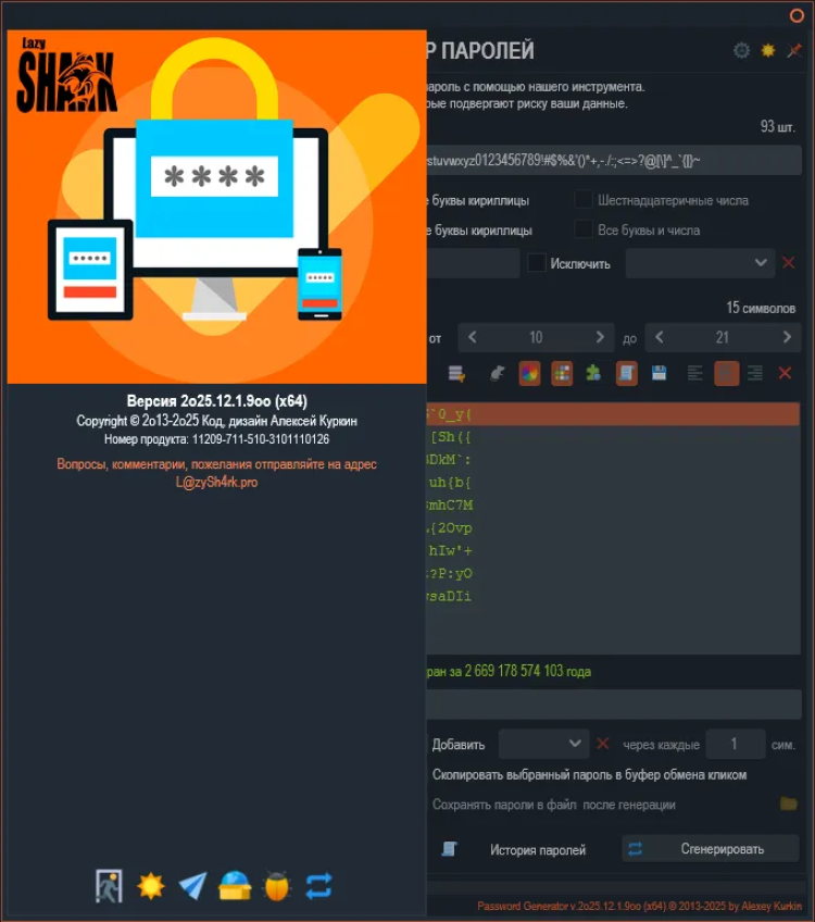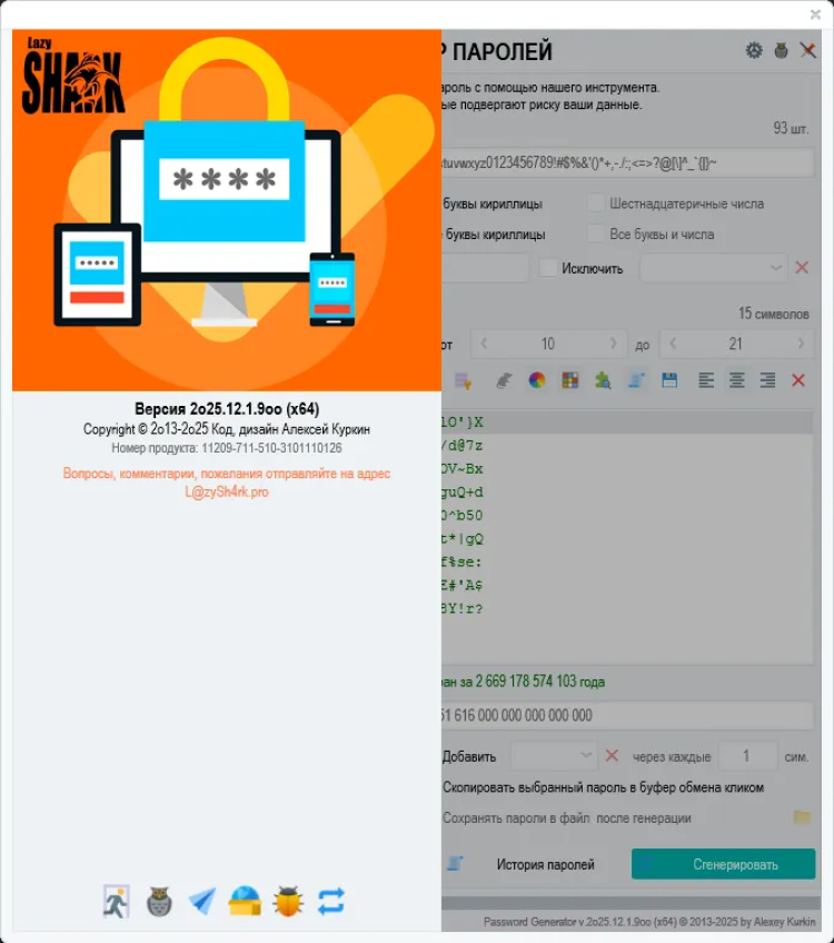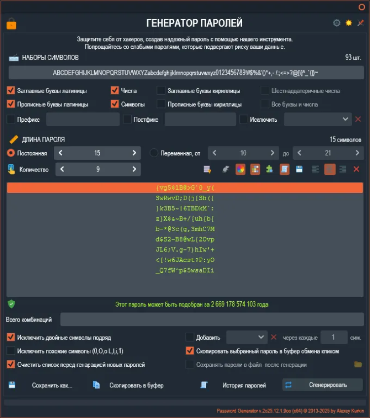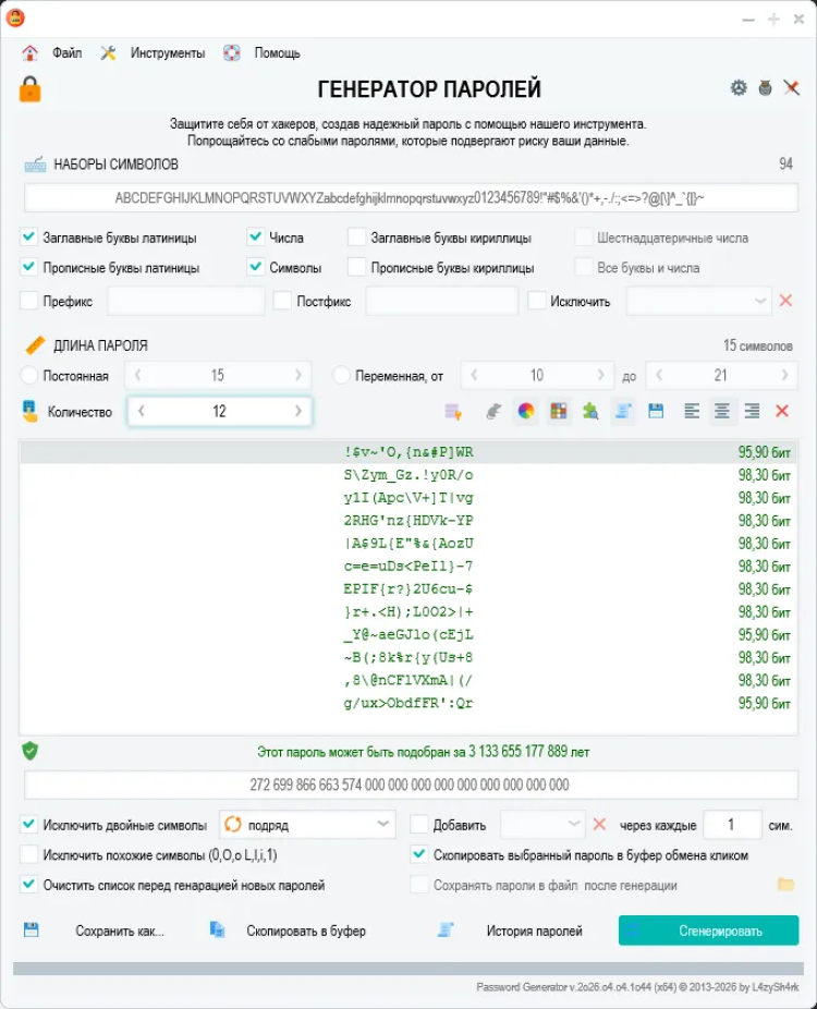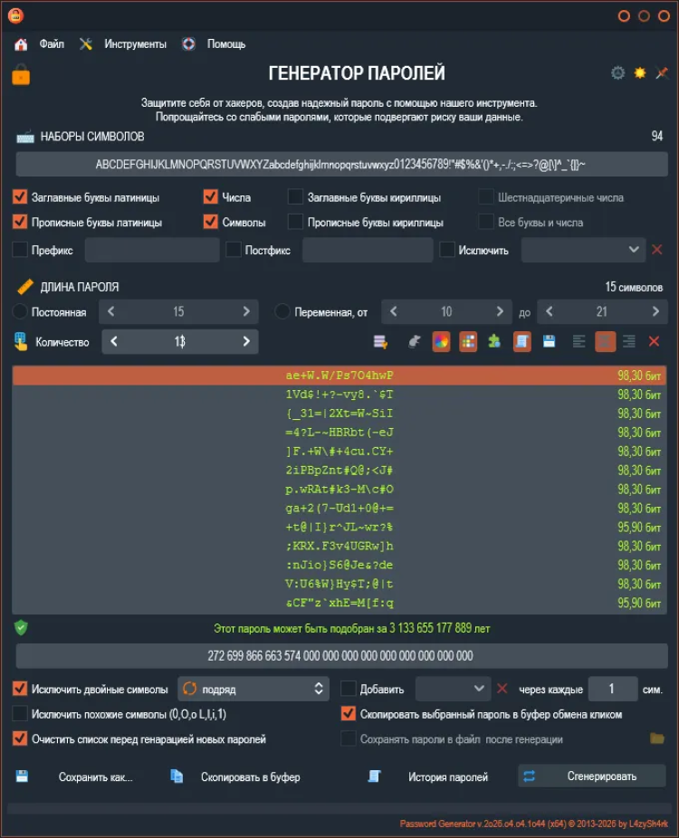 Password Generator - это простой и безопасный инструмент для генерации надежных паролей. Эта программа помогает создавать сложные пароли, состоящие из различных символов, которые могут быть необходимы для защиты ваших учетных записей и личных данных в Интернете.