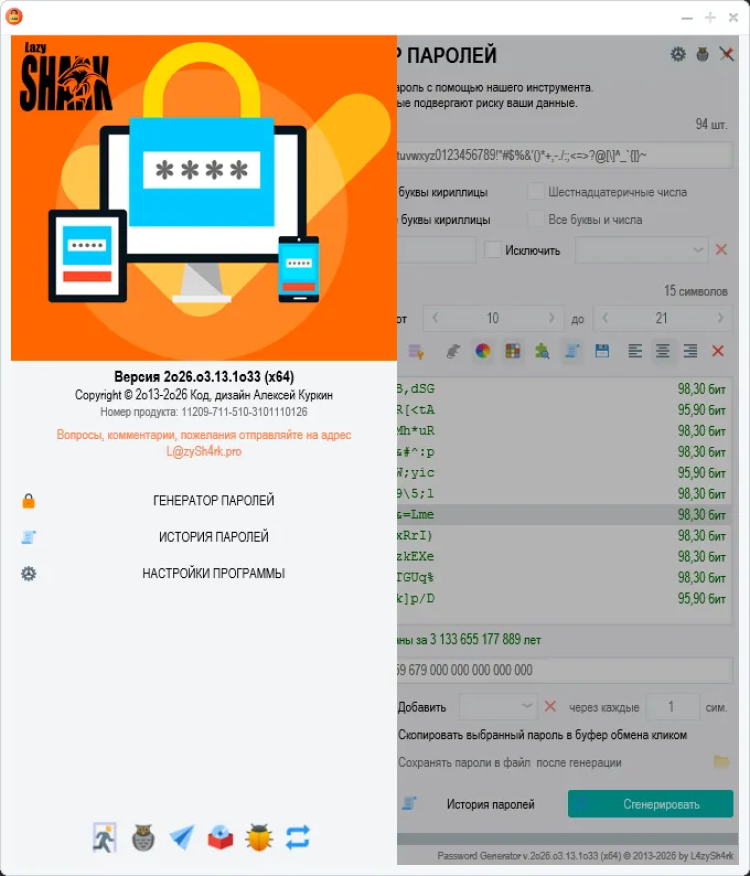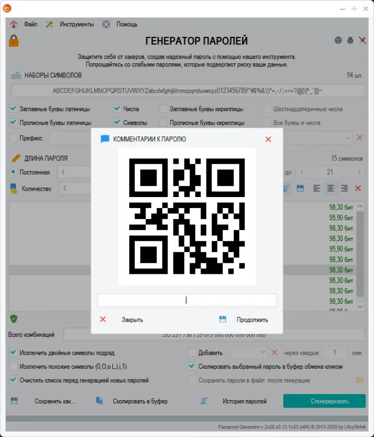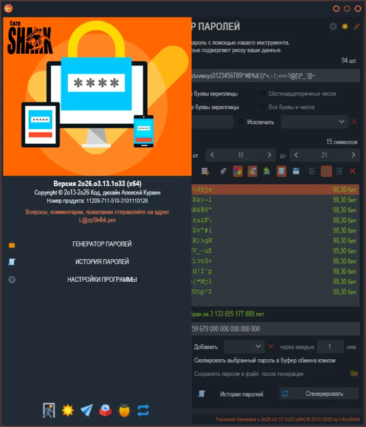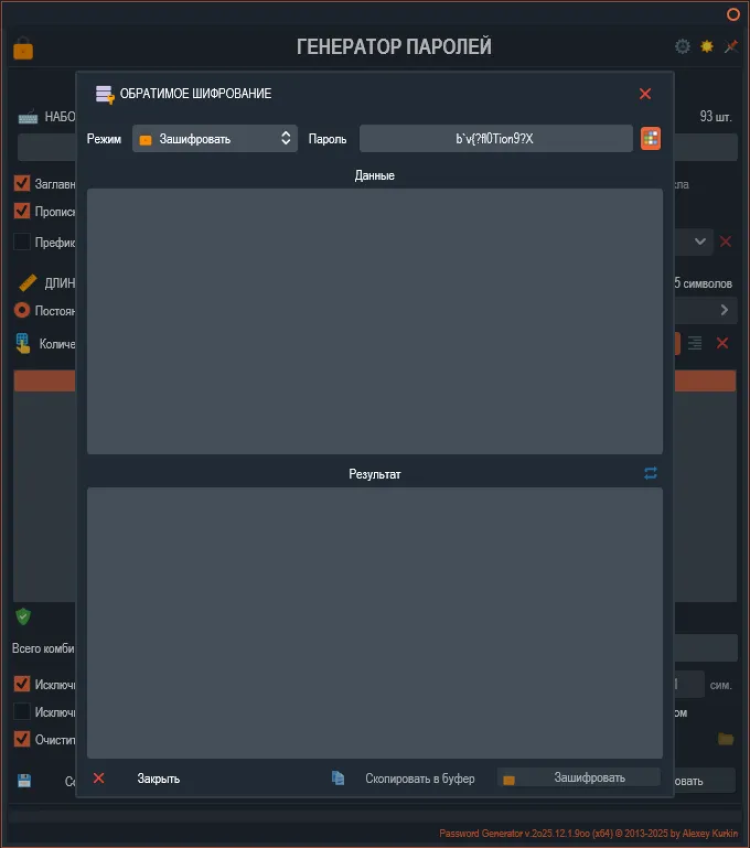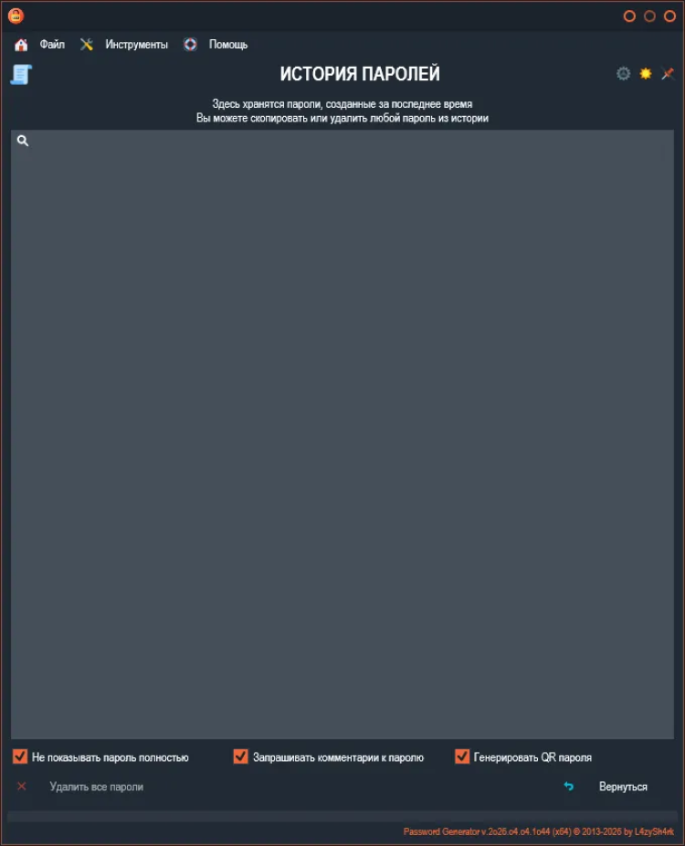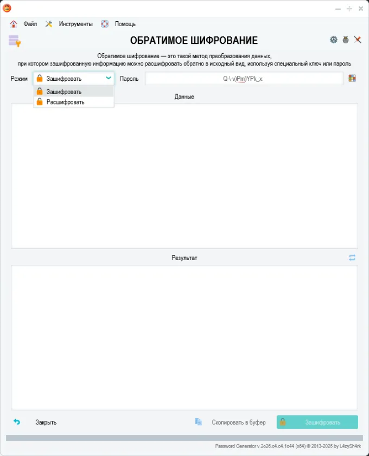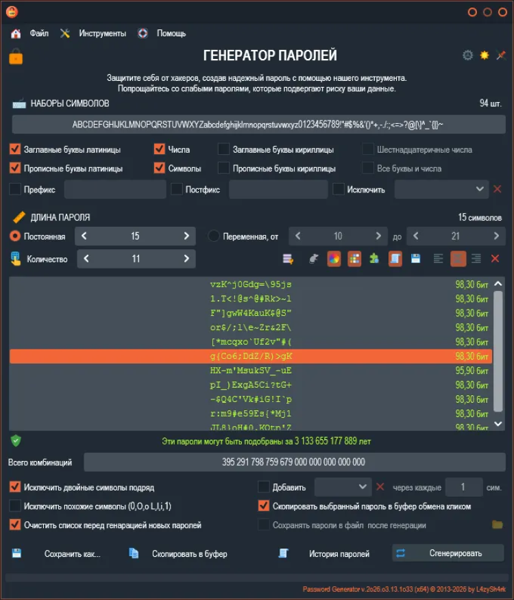 Password Generator - это простой и безопасный инструмент для генерации надежных паролей. Эта программа помогает создавать сложные пароли, состоящие из различных символов, которые могут быть необходимы для защиты ваших учетных записей и личных данных в Интернете.