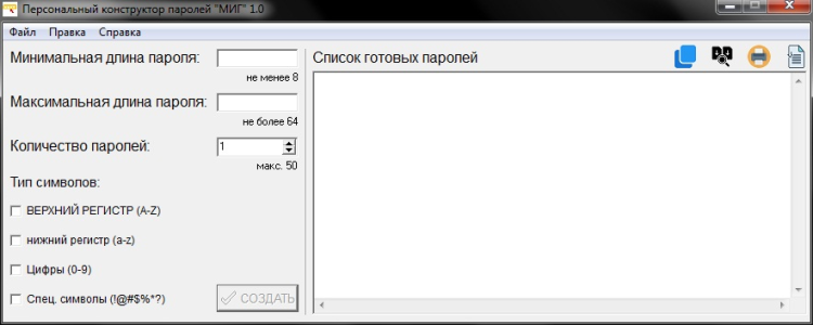 Персональный конструктор паролей МИГ - современное решение для формирования безопасной и удобной коллекции паролей под любые задачи. Программа создана для тех, кто ценит надежность, скорость и гибкость настройки. С её помощью вы можете легко генерировать резервные наборы паролей, адаптированные под ваши требования к сложности и длине, без риска повторов и с возможностью удобного использования в повседневной работе.