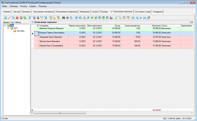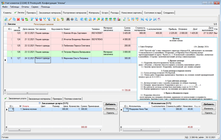 В данной программе имеется возможность формирования клиентской базы со всеми необходимыми характеристиками по клиенту. Учет заказов клиентов, оказанных услуг и проданных материалов, формирование графика примерок и баланса клиентов, учет расходов ателье, генерация договоров с клиентами на пошив одежды, складской учет (приход и продажа материалов для пошива одежды, актуальное состояние склада) а также получение отчетов по этим данным.Гибкая структура базы данных дает возможность создавать новые таблицы, отчеты, графики, добавлять поля, формировать списки и многое другое. Программа учета интуитивно проста и понятна, не требует специальных знаний и квалификации в ИТ-сфере.