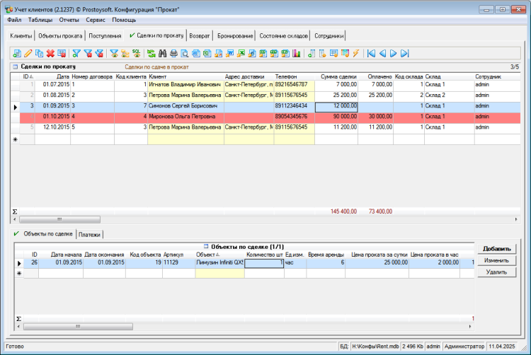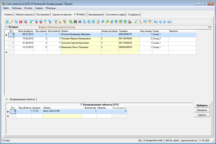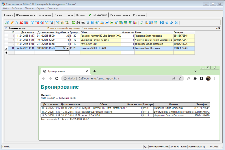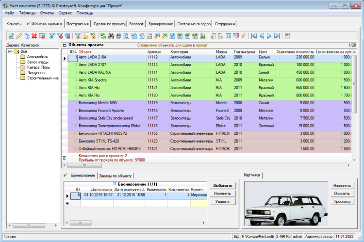 Простой софт Прокат — программа позволит усовершенствовать процесс обслуживания клиентов благодаря ведению всестороннего учета. Имеется возможность учета номенклатуры инвентаря и всей необходимой информации каждой единицы, контроль сдачи инвентаря в прокат и его возврата, предварительное бронирование, складской учет, а также получение отчетов по всем данным. Гибкая структура базы данных дает возможность создавать новые таблицы, отчеты, графики, добавлять поля, формировать списки и многое другое. Программа учета интуитивно проста и понятна, не требует специальных знаний и квалификации в ИТ-сфере.