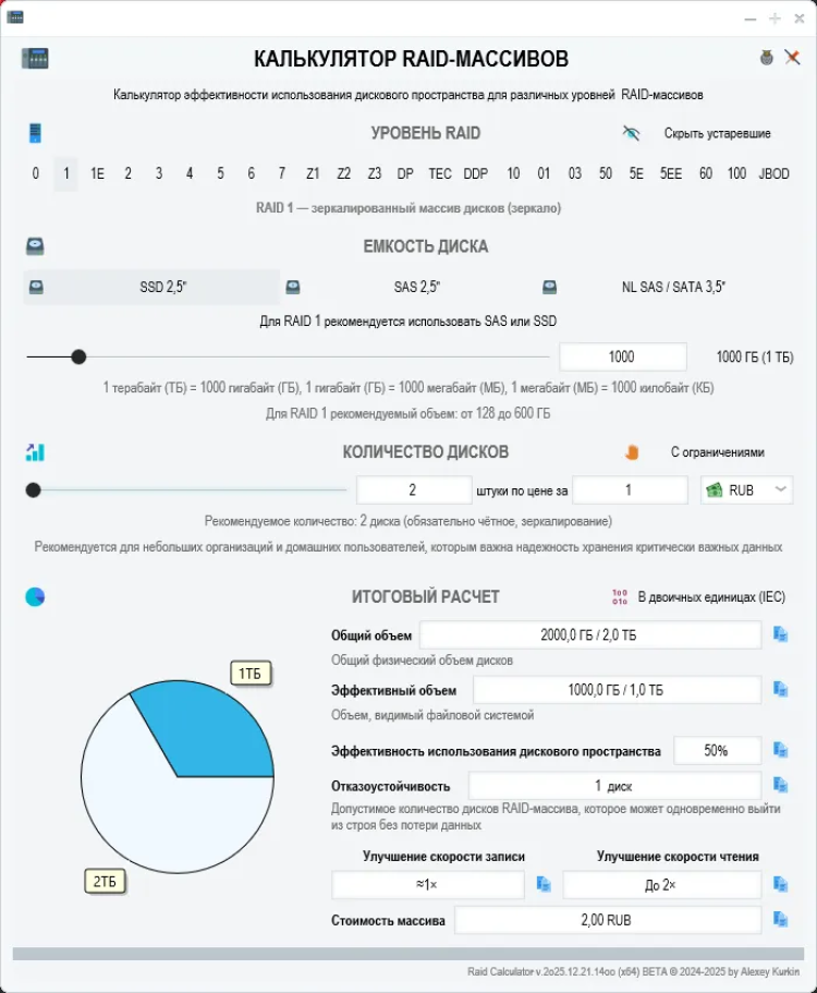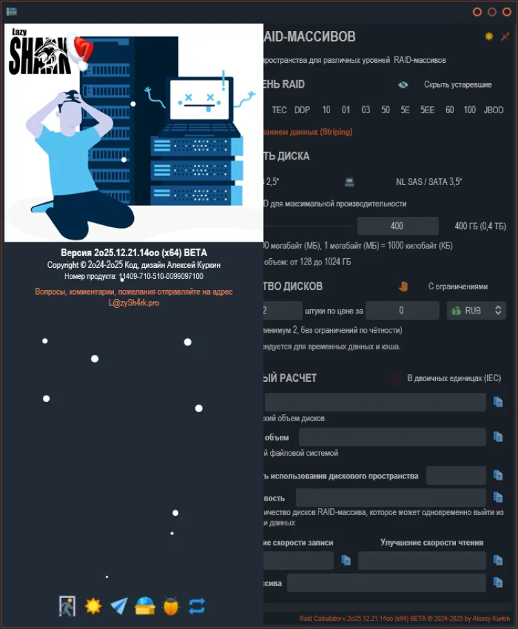 RAID Calculator - это бесплатный инструмент для расчёта эффективности использования дискового пространства при создании различных уровней RAID-массивов. Программа поможет вам заранее оценить параметры будущего массива и принять взвешенное решение о его конфигурации