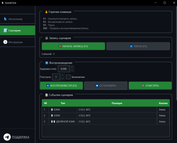SceneClick - это бесплатная программа для автоматизации кликов мышью под Windows. Она записывает ваши действия (клики, двойные клики, перетаскивания) и может воспроизводить их с идеальной точностью любое количество раз.