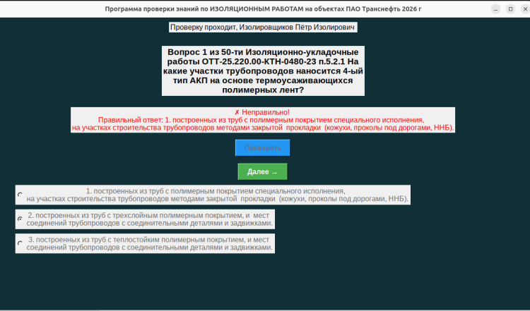 Программа тестирования знаний Инженера СК ИЗОЛЯЦИОННЫХ работ - это ПО для тестирования знаний Инженера строительного контроля на знание ИЗОЛЯЦИОННЫХ работ, выполняемых на объектах ПАО “Транснефть”, начиная с 2026 г. Программа не требует установки на ПК. Программа запускается прямо нажатием на иконку программы, например , с рабочего стола на ПК. Программа не требует подключение к сети интернет. Результат тестирования - сохраняется в файл, в том же месте , где и расположена сама программа, например на Рабочем столе вашего ПК с windows 10 или windows 11.