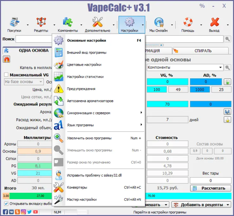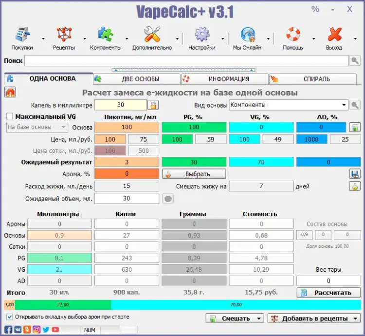 В упрощенной версии вы можете быстро посчитать ваш замес как в объемных, так и в массовых долях, но если вам необходимо вести полный учет аром и компонентов - добро пожаловать в расширенную версию, где вы сможете: