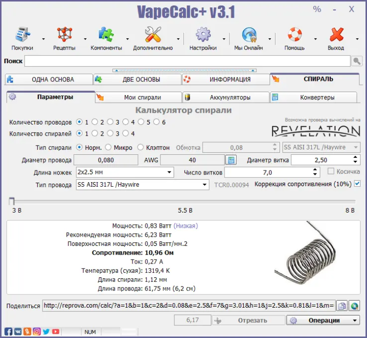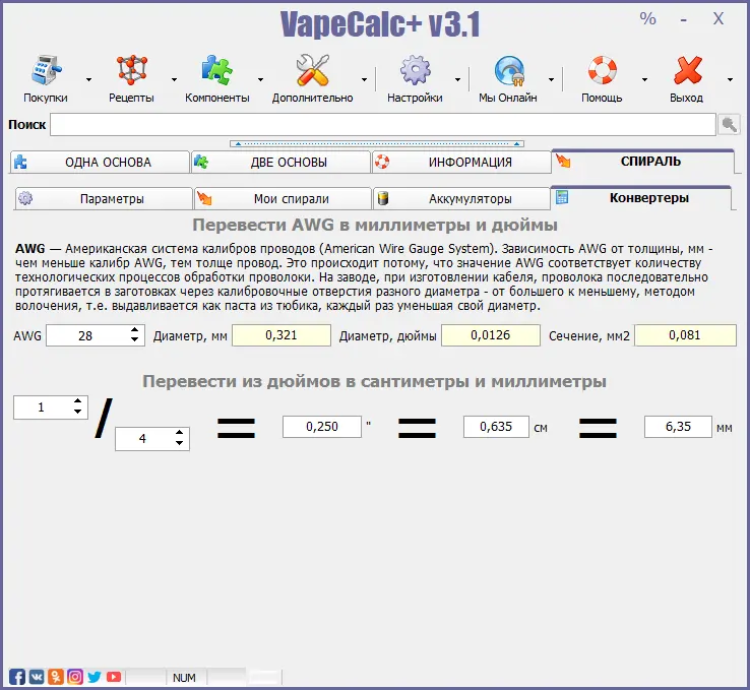 VapeCalc+ Reborn - удобная и многофункциональная программа для вейперов и любителей электронных сигарет. Она предназначена для расчета параметров и мощности устройства, а также предоставляет информацию о различных жидкостях, ароматизаторах и компонентах для вейпинга, которая к тому же имеет и огромный арсенал полезных инструментов. С VapeCalc+ вы сможете легко определить оптимальные настройки для своих модов и атомайзеров, чтобы получить максимальное удовольствие от парения.
